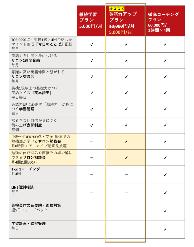 高い英語レベルの視座を身につけ、目標を突破する英語力を身につけるプランです(10,000 →5,000円/月)